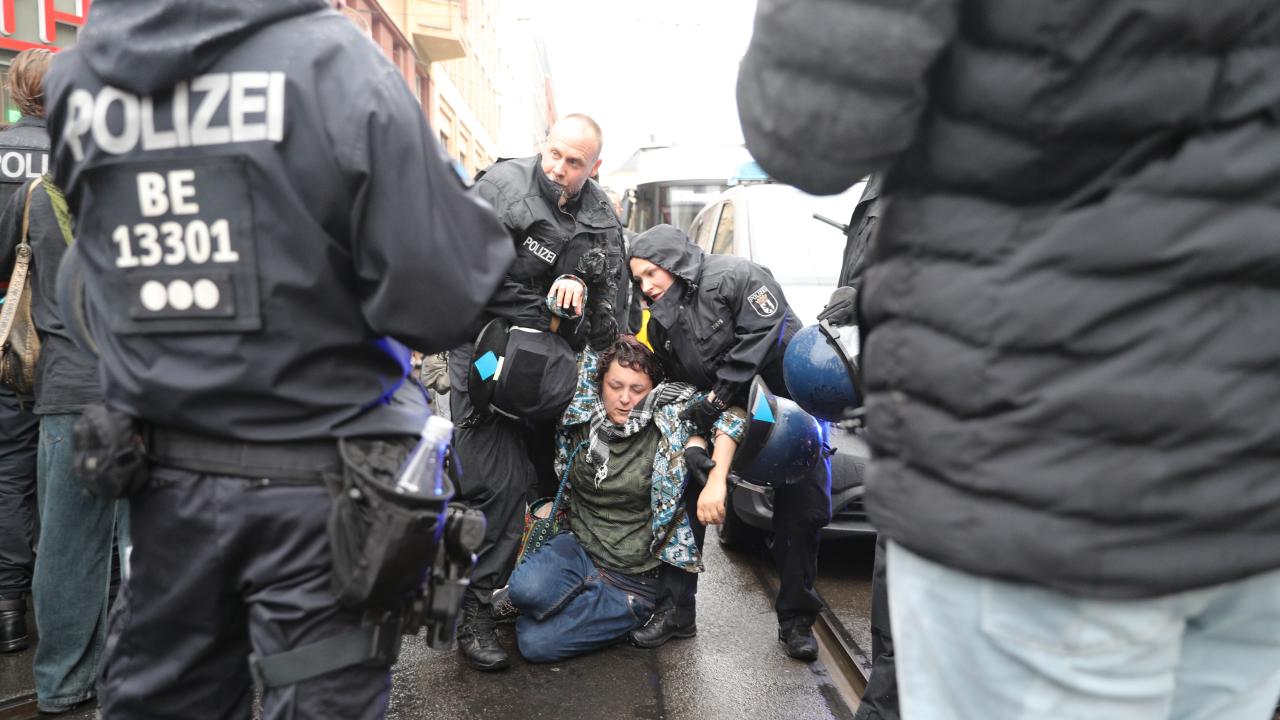 Berlin polisi Filistin’e destek eylemine sert müdahale etti. Zaman zaman göstericiler ile polis arasında arbede yaşandı, polis bir kadın göstericiyi yumrukladı ve 8 göstericiyi gözaltına aldı.