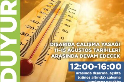 Çalışma ve Sosyal Güvenlik Bakanlığı, aşırı sıcakların etkili olacağı 11–15 Ağustos tarihlerinde, 12.00–16.00 saatleri arasında açık alanda ve güneş altında çalışmayı yasakladı. Yasağa uymayanların te...