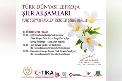Türk Edebiyatı Vakfının, Türk Dünyası’nın kültürel bağlarını güçlendirmek ve ortak edebi mirası yaşatmak amacıyla düzenlediği “Türk Dünyası Lefkoşa Şiir Akşamları”, bu yıl 1-3 Ağustos 2025 tarihleri a...