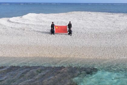 Çin devlet medyası, Çin Sahil Güvenliği (CCG) personelinin, Güney Çin Denizi’nde Çin’de Tiexian Resifi olarak bilinen Sandy Cay’e Çin milli bayrağını dikerken çekilen fotoğrafl...