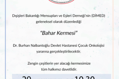 Dışişleri Bakanlığı Mensupları ve Eşleri Derneği’nin (DİMED) her yıl geleneksel olarak düzenlediği “Bahar Kermesi” 29 Mayıs Perşembe günü yapılacak. Dışişleri Bakanlığı bahçesinde saat 10.30’da başlay...