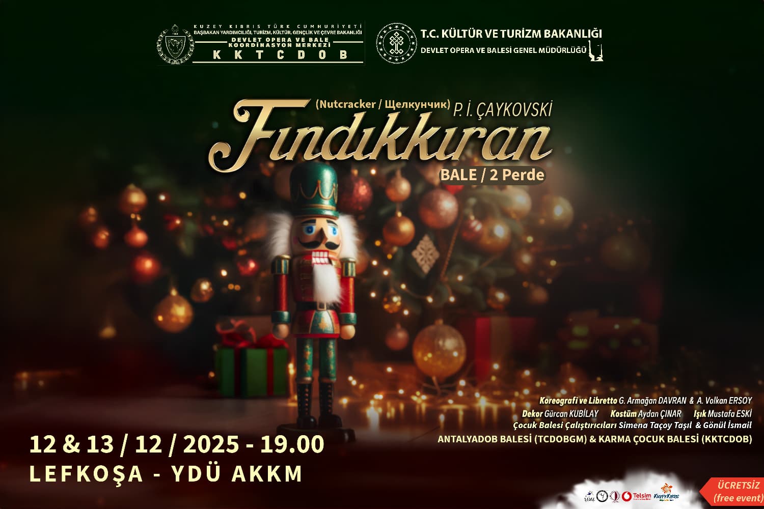 Her yıl dünyanın önemli opera ve bale kuruluşlarının sezon takvimlerinde yer alan bu klasik eser, KKTCDOB’un Stage Dance Studio ve The Cyprus Dance Education Centre iş birlikleriyle oluşturduğu Fındıkkıran Karma Çocuk Balesi ile Antalya DOB Bale sanatçılarının ortak yorumuyla sahnede olacak.
