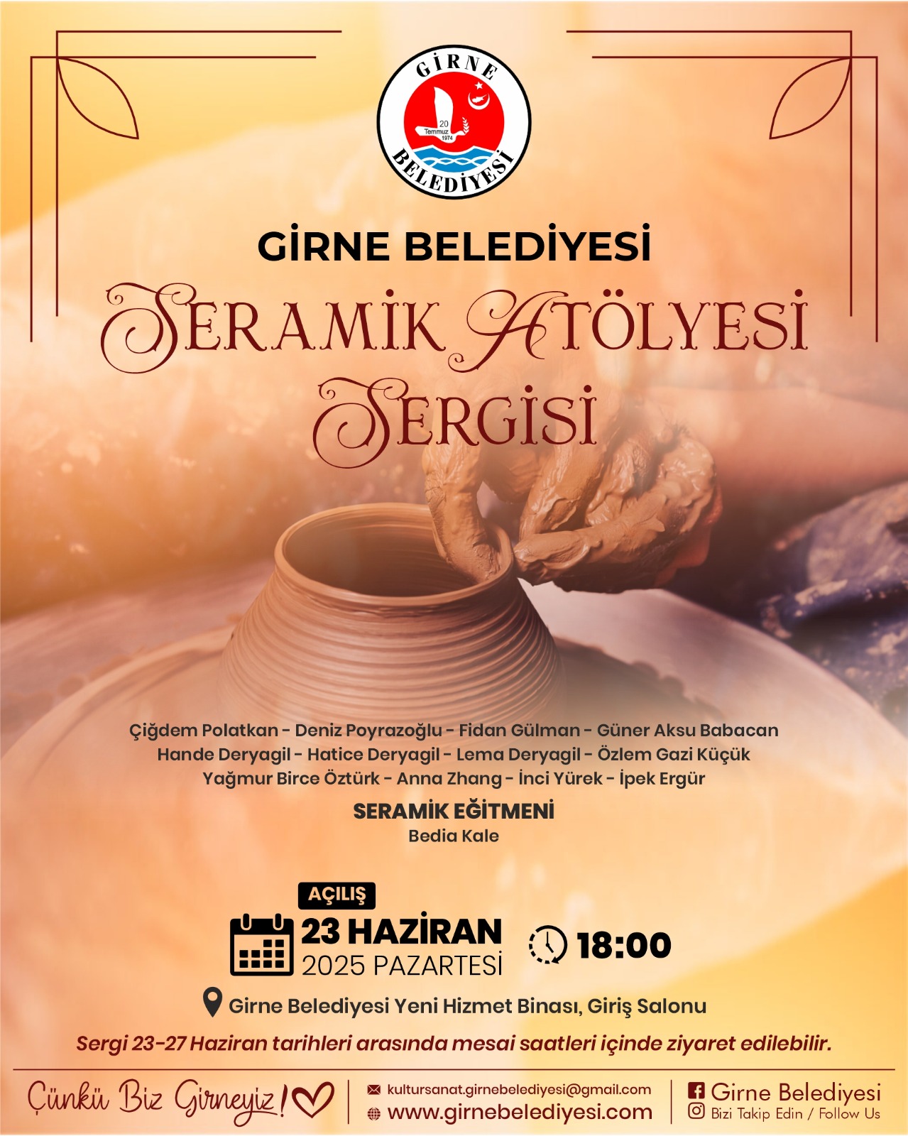 Girne Belediyesi tarafından Seramik Eğitmeni Bedia Kale öncülüğünde gerçekleştirilen “Seramik Atölyesi Sergisi”, 23 Haziran Pazartesi günü saat 18.00’de Girne Belediyesi Yeni Hizmet Binası’nda açılıyor.
