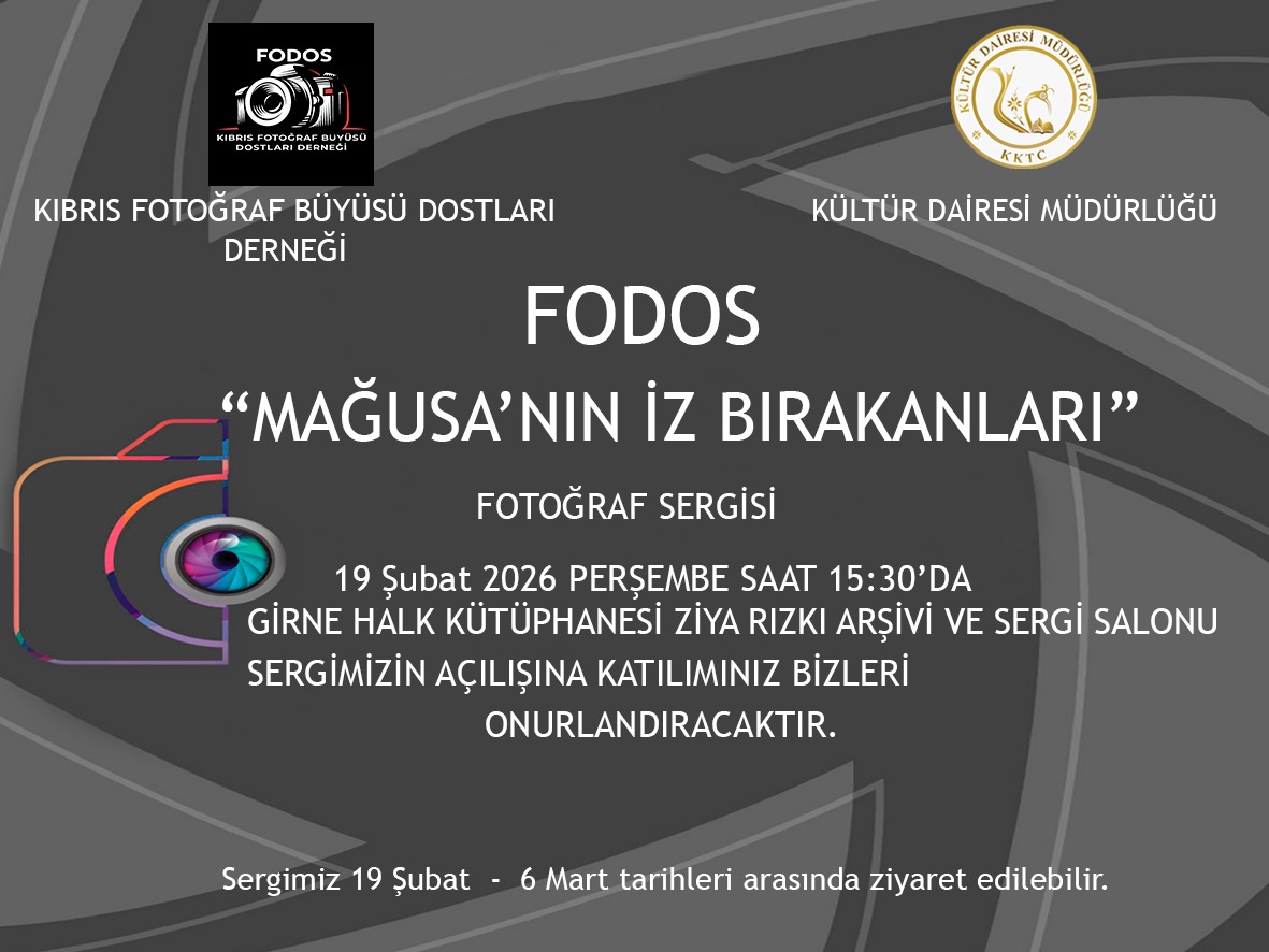 Başbakan Yardımcılığı Turizm Kültür Gençlik ve Çevre Bakanlığı’na bağlı Kültür Dairesi’nin Güzel Sanatlarla İlgili Derneklere Yardım Tüzüğü kapsamında katkı yaptığı Kıbrıs Fotoğraf Büyüsü Dostları Derneği’nin (FODOS) “Mağusa’nın İz Bırakanları” isimli fotoğraf sergisi, Girne Halk Kütüphanesi Ziya Rızkı Arşivi ve Sergi Salonu’nda sanatseverlerin izlenimine sunuluyor.