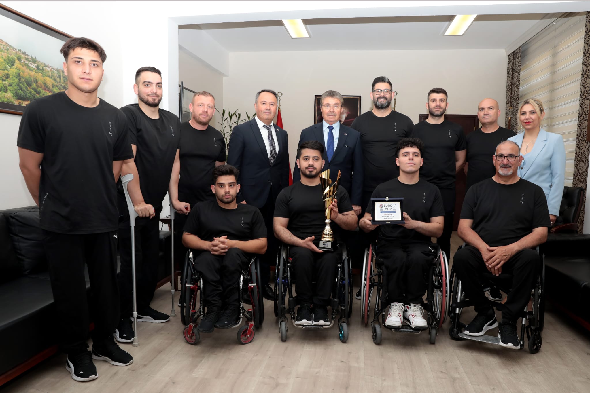 Başbakan Ünal Üstel, Avrupa Kupası 2026 ön eleme turnuvası kupasında birincilik elde eden Vakıflar Tekerlekli Sandalye Basketbol takımını ve KKTC Engelliler Spor Federasyonu Başkanı Ahmet Akdeniz’i kabul etti.